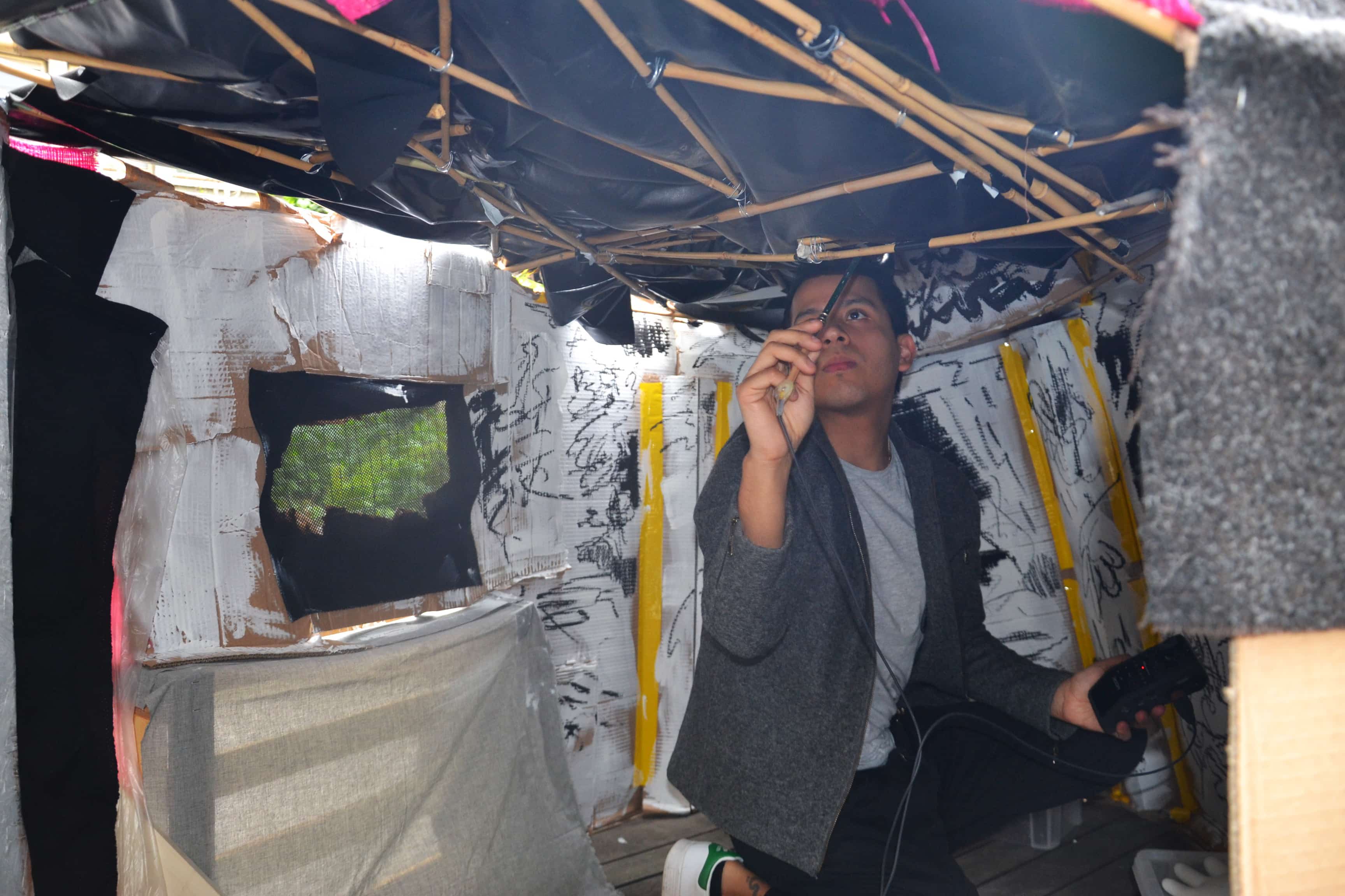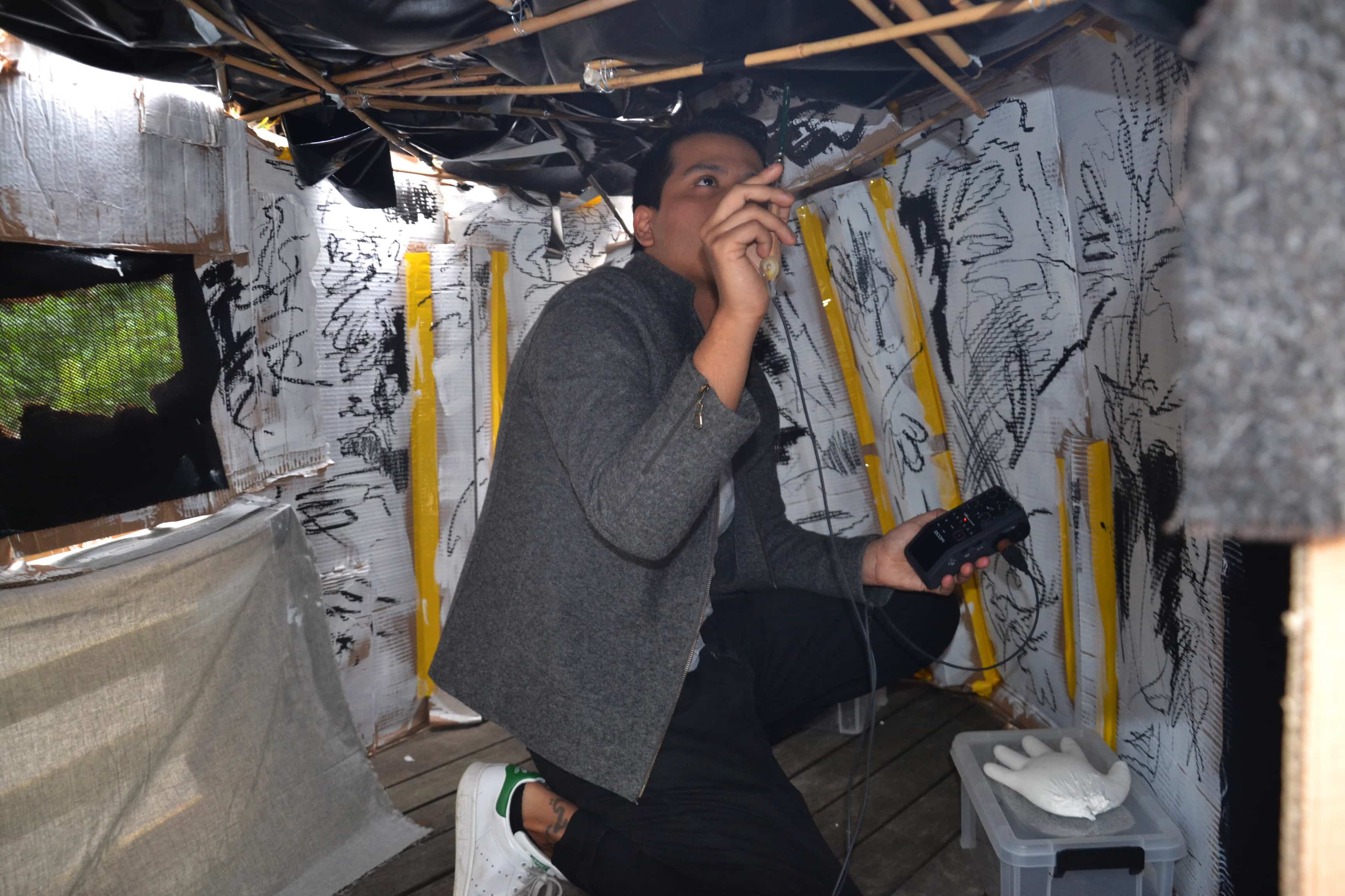 Once the structure of the shelter was built, utilizing a device that allows to record the sound of the marks and traces made by the drawing of the pencil to which it is connected; the artist utilizes the act of drawing as a process of scanning all the inner surroundings of the structure he has built in order to keep traces of memory through sound of what once became meaningful and part of a creation process.